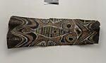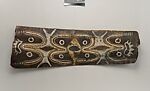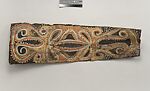 This ceiling is composed of over 270 paintings (pangal ) commissioned from contemporary Kwoma artists in the village of Mariwai in 1970 and 1973 by Douglas Newton, the first curator of Oceanic art at the Metropolitan Museum, and shipped to New York. In 2007, when the Oceania galleries were renovated, the panels were attached to a new superstructure and a carved finial feature placed at each end. Although less steeply pitched than the Kwoma houses found in villages today, the installation evokes the essential form of a ceremonial house ceiling. Together these suspended panels form an impressive and spectacular installation in the Metropolitan Museum which, at 80.4 feet (24.5 meters) end-to-end, is the largest contemporary art installation in the museum.